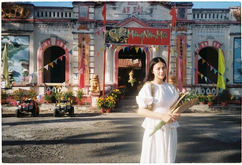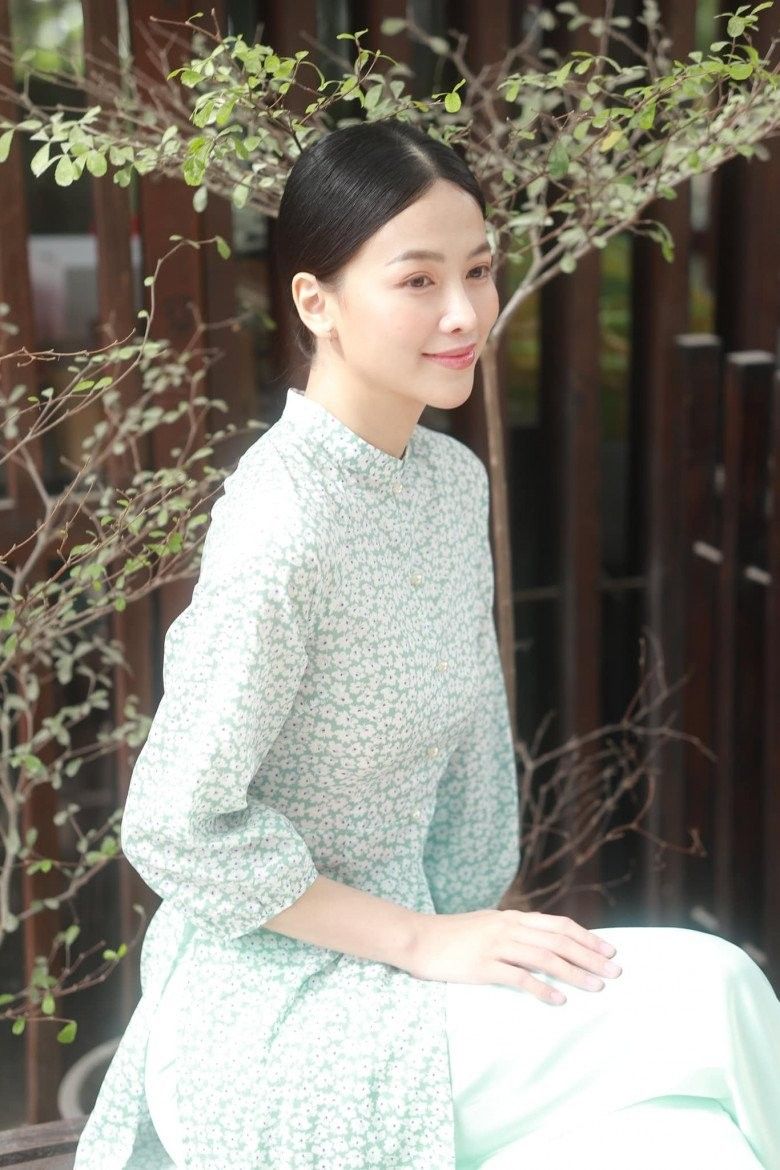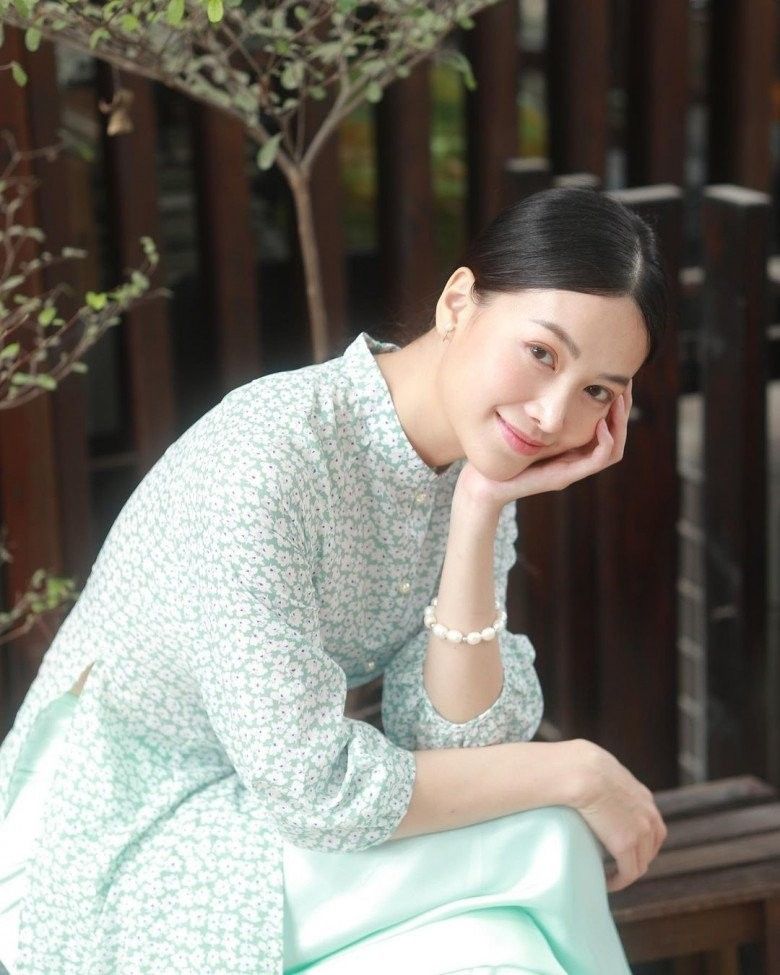 Người đẹp không phối hợp phụ kiện cầu kì với chiếc áo dài Xuân cổ điển mà chỉ nhẹ nhàng với đôi bông nhỏ nhắn, chiếc vòng tay ngọc trai xinh.