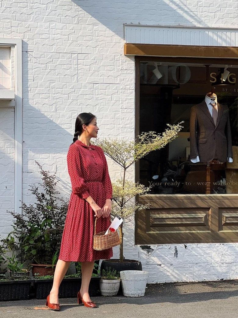 Đi chúc Tết đâu cần phải diện áo dài mới gọi là Tết! Nàng cứ chọn một chiếc đầm đỏ, chỉn chu với tóc tai gọn gàng là rạo rực không khí đón Xuân.
