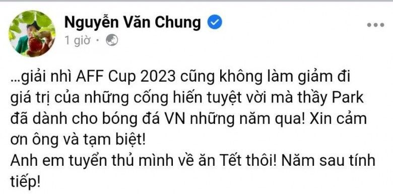 Nhạc sĩ Nguyễn Văn Chung nhắn gửi: "Giải nhì AFF Cup 2023 cũng không làm giảm đi giá trị của những cống hiến tuyệt vời mà thầy Park đã dành cho bóng đá Việt Nam những năm qua".