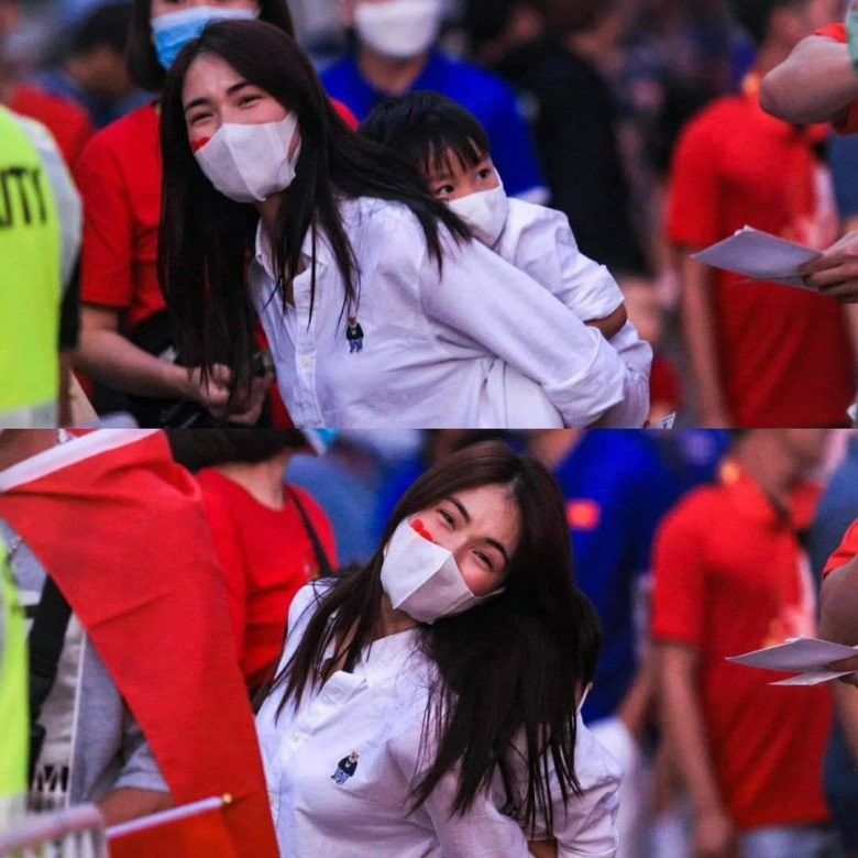 Ca sĩ Hòa Minzy và con trai có mặt trên khán đài để ủng hộ đội tuyển Việt Nam thi đấu.