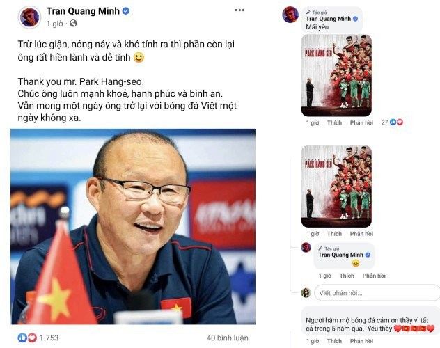 Nổi tiếng là người yêu bóng đá, BTV Trần Quang Minh gửi lời chúc bình an đến thầy Park, mong thầy có thể trở lại với bóng đá Việt Nam. Anh viết: "Trừ lúc giận, nóng nảy và khó tính ra thì phần còn lại ông rất hiền lành và dễ tính. Thank you Mr. Park Hang-seo. Chúc ông luôn mạnh khoẻ, hạnh phúc và bình an. Vẫn mong một ngày ông trở lại với bóng đá Việt một ngày không xa".