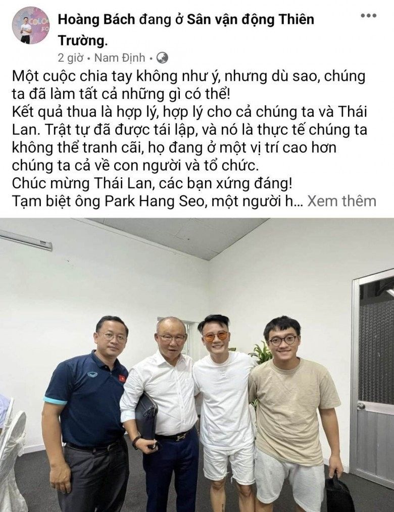 Hoàng Bách bày tỏ sự tiếc nuối khi nói lời tạm biệt ông Park Hang Seo. Anh viết: "Tạm biệt ông Park Hang Seo, một người hùng với những cống hiến lịch sử cho bóng đá Việt Nam".
