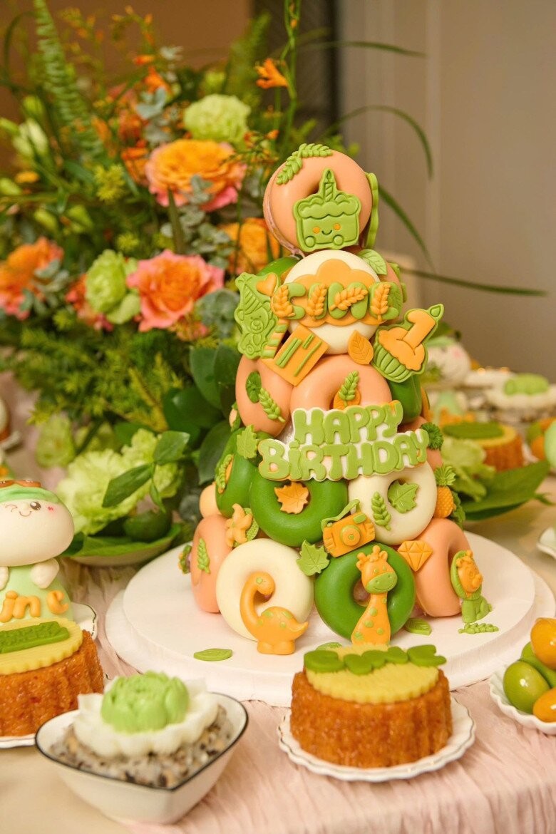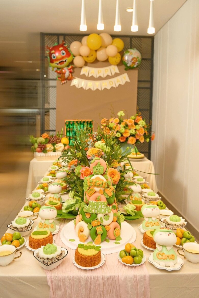 Mẹ bỉm Linh Phi chu đáo đặt một mâm cúng với đầy đủ các lễ vật như hoa quả, bánh sinh nhật, bánh thạch, xôi, chè, lá trầu, quả cau, trà, nến, gà luộc, hoa quả, vàng mã, ... được xếp đặt cẩn thận, đẹp mắt trên bàn, cắt tỉa tỉ mẩn từng li từng tí. Tất cả được chuẩn bị với màu sắc cam xanh làm trung tâm và xen kẽ màu vàng trắng mát mắt. Nhìn mâm cúng thôi nôi xinh xắn, rực rỡ của bé Cine mới thấy được sự đầu tư chỉn chu, hoành tráng của vợ chồng Quang Tuấn - Linh Phi.