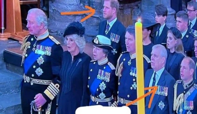 Hoàng tử Andrew không được mặc quân phục vì bị trục xuất khỏi hoàng gia vì hàng loạt bê bối lạm dụng các bé gái chưa đủ tuổi thành niên. Trong khi đó, Hoàng tử Harry tự nguyện từ bỏ quyền thừa kế Hoàng gia Anh. Trước đó anh được vua cha đặc cách cho mặc quân phục đi dự lễ tưởng niệm Nữ hoàng. Khi đó, Harry bị dư luận Anh chỉ trích trên mạng. Vì vậy, ở đám tang truyền hình trực tiếp cả thế giớ, vị hoàng tử này không được phép mặc quân phục lần nữa.