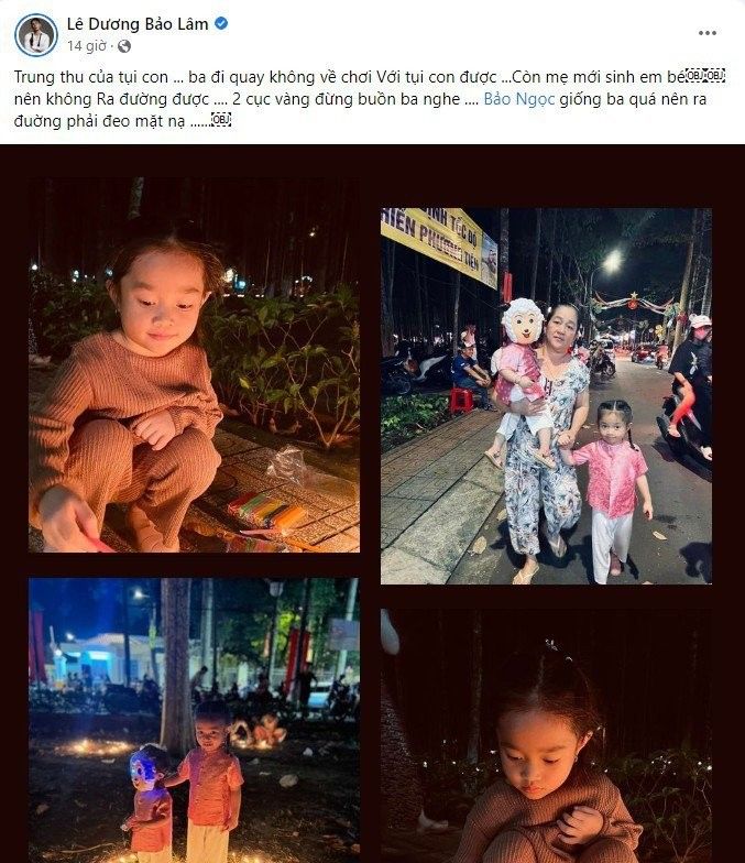 Lê Dương Bảo Lâm xúc động chia sẻ: "Trung thu của tụi con. Ba đi quay không về với tụi con được. Còn mẹ mới sinh em bé không ra đường được. 2 cục vàng đừng buồn ba nha".