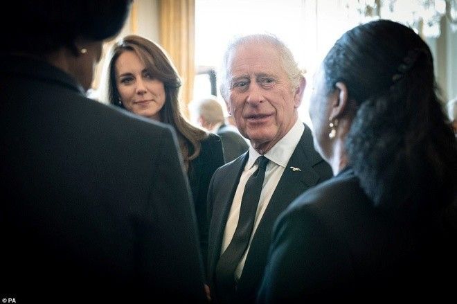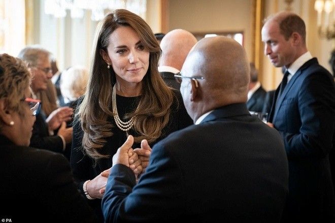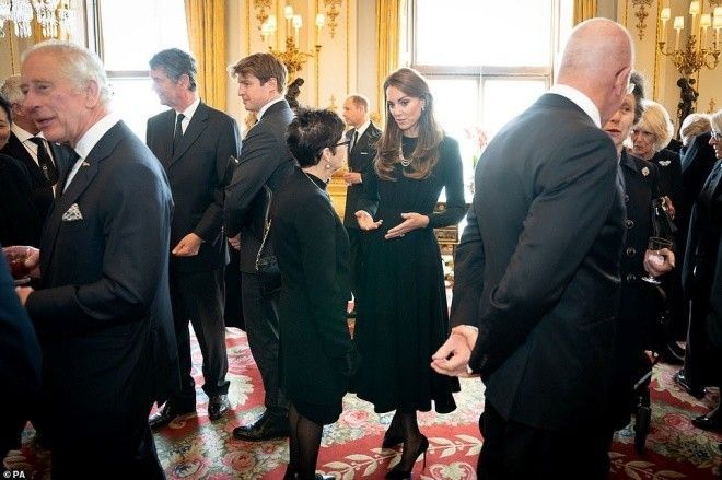 Xuất hiện tại sự kiện, Kate mặc váy đen dài, đeo vòng cổ, vòng tay và bông tai ngọc trai. Cô tỏa ra khí chất của một Vương phi vừa sang chảnh vừa dịu dàng, tinh tế. Cuộc trò chuyện của Kate và Camilla được nhiều người quan tâm. Thực tế, quan hệ của bà Camilla với Hoàng tử Harry và William vốn rất bình thường thậm chí có phần gượng gạo. Nhưng sau khi Nữ hoàng qua đời, tình cảm của cặp mẹ kế - con chồng tốt dần lên. Vì vậy Kate cũng thoải mái với mẹ kế chồng hơn.