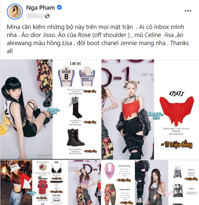 Cô viết: "Mina cần kiếm những bộ này trên mọi mặt trận. Ai có inbox mình nha. Áo Dior Jisoo. Áo của Rose (off shoulder), mũ Celine - Lisa, áo Alexander Wang màu hồng Lisa, đôi boot Chanel Jennie mang nha. Thanks all".