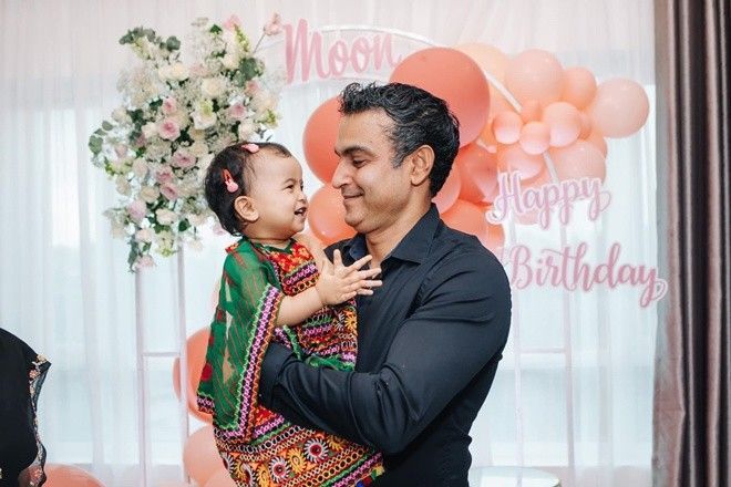 Con gái lai Ấn của Võ Hạ Trâm cười rạng rỡ khi chụp ảnh cùng bố.