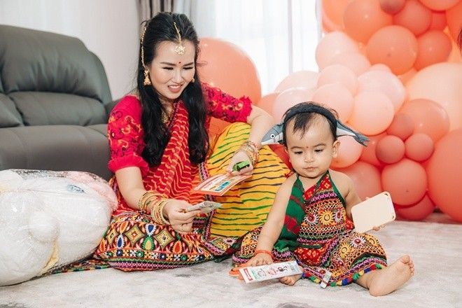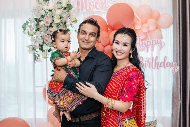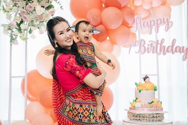 Tròn 1 năm bé Moon chào đời, vợ chồng Võ Hạ Trâm đã tổ chức tiệc sinh nhật tại gia cho con gái với sự có mặt của bà nội, cô ruột và người thân từ Ấn Độ sang. Điểm đặc biệt nhất của bữa tiệc chính là việc cả gia đình nữ ca sĩ, trong đó có bé Moon đều mặc trang phục truyền thống Ấn Độ.