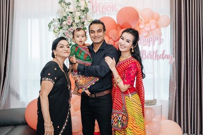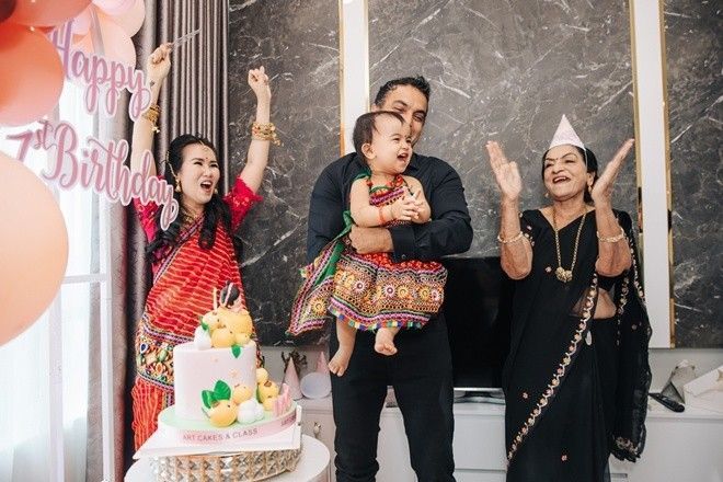 Bữa tiệc ấm cúng có sự xuất hiện của nhiều người thân bên nội, đã lặn lội từ Ấn Độ sang Việt Nam để dự sinh nhật 1 tuổi của bé Moon.