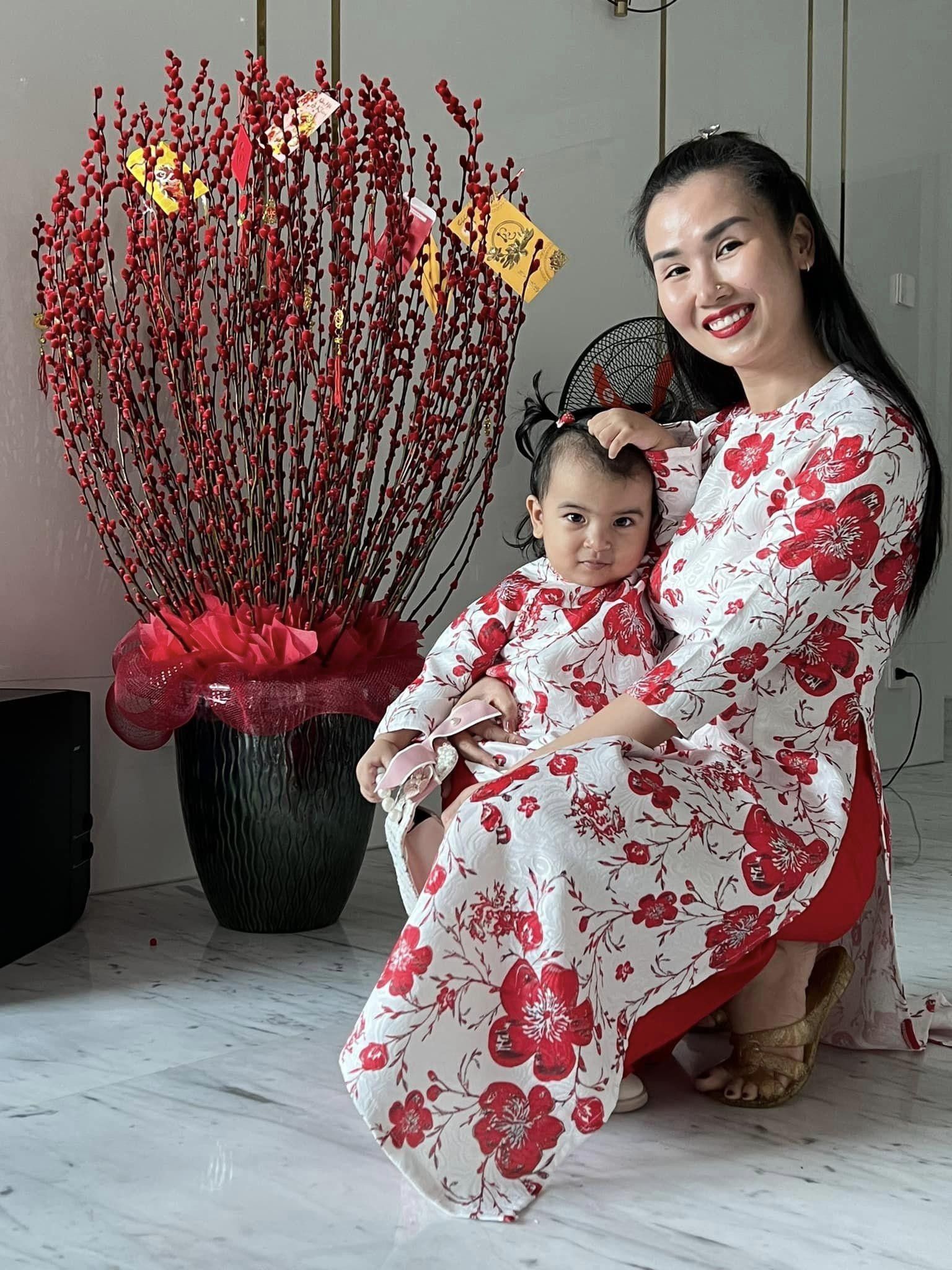 Em bé mặc áo dài màu sắc với mẹ trong dịp Tết. Các thiết kế được may cách điệu phần tà ngắn bớt, phù hợp với hoạt động của nhóc tì.