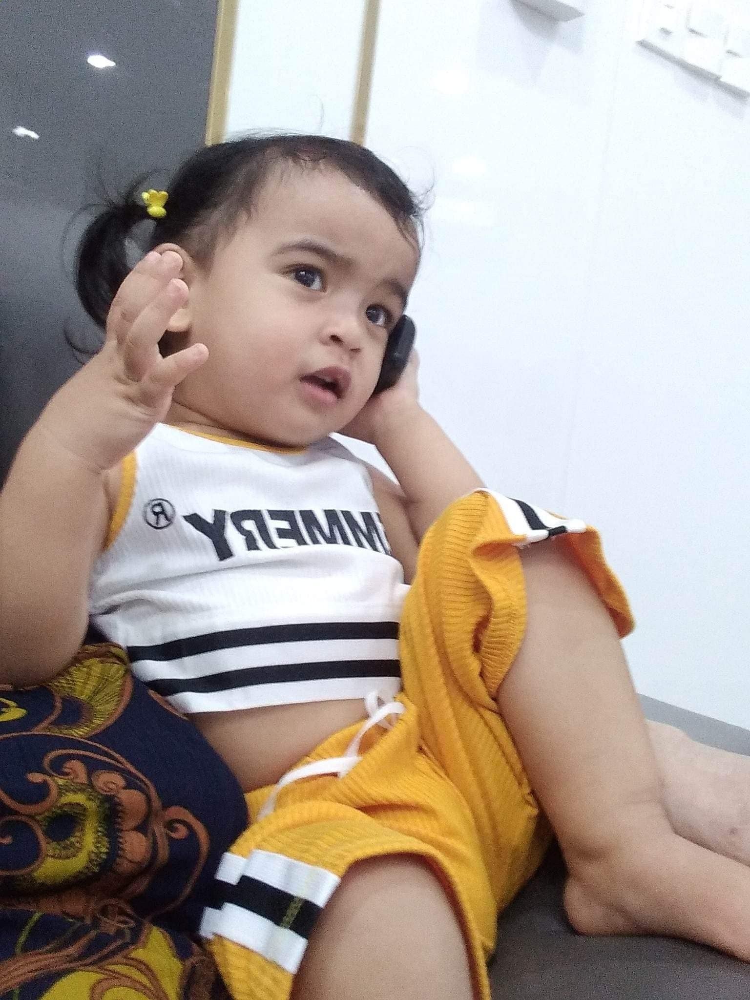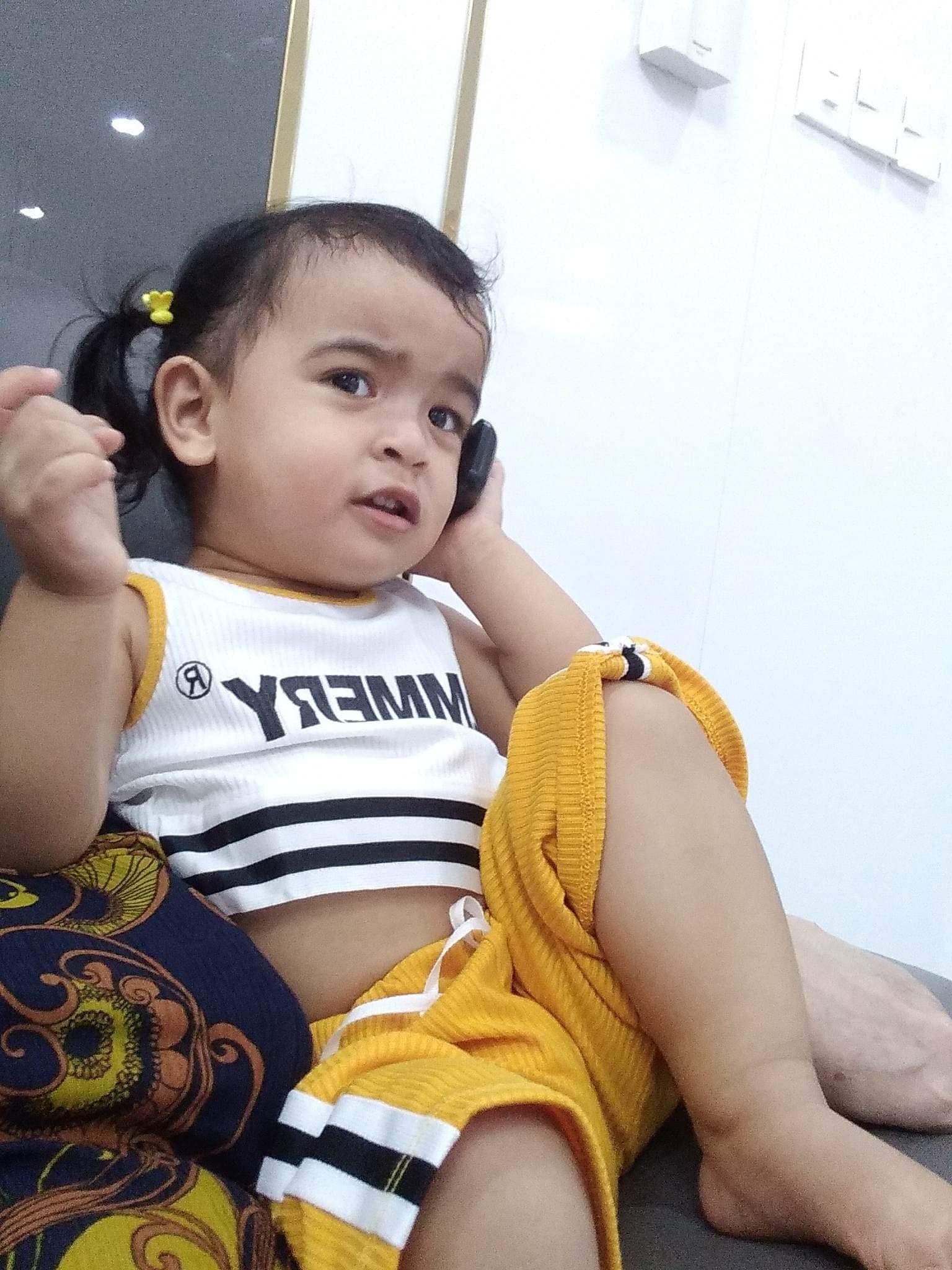 Combo đồ mặc chơi trong nhà này cứ ngỡ được thiết kế bởi mẹ Trâm nhưng lại đến từ chính bà vú. Nữ ca sĩ đăng ảnh Moon cùng dòng chú thích: "Mẹ xuống cho con lên nha mẹ. Em gái Moon 23 tháng tuổi mà như 5 tuổi".