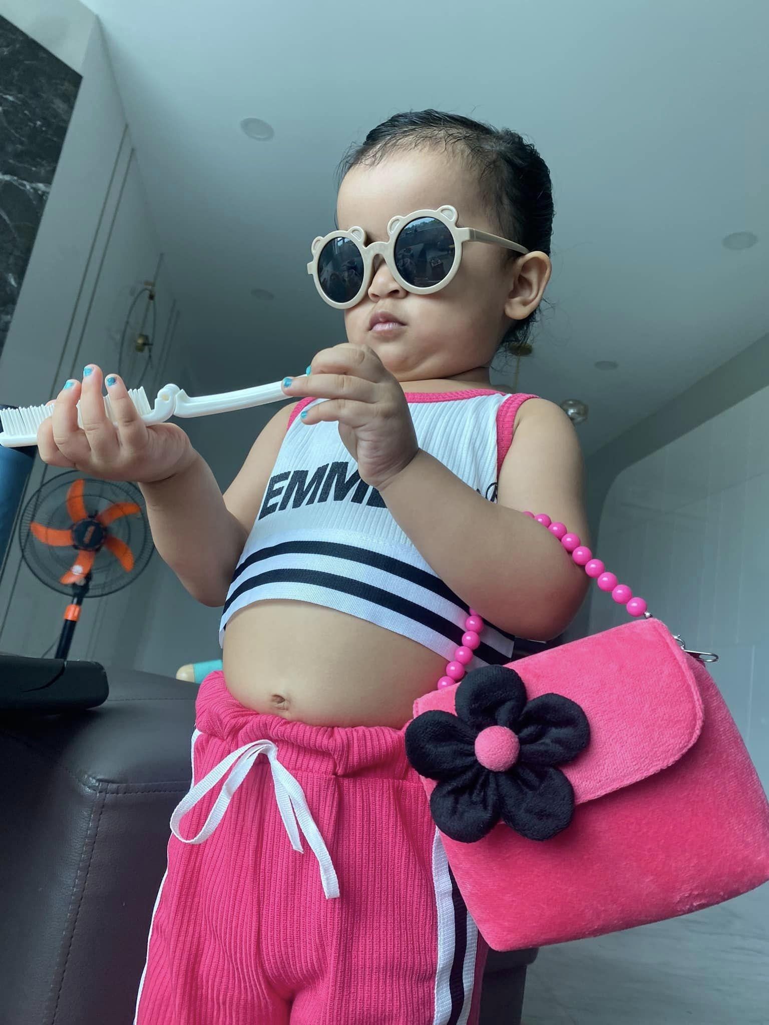Nếu lâu không theo dõi Võ Hạ Trâm trên facebook có lẽ nhiều người sẽ bất ngờ trước độ lớn của bé Moon. Em bé mặc một set đồ màu hồng và tạo dáng cool ngầu.