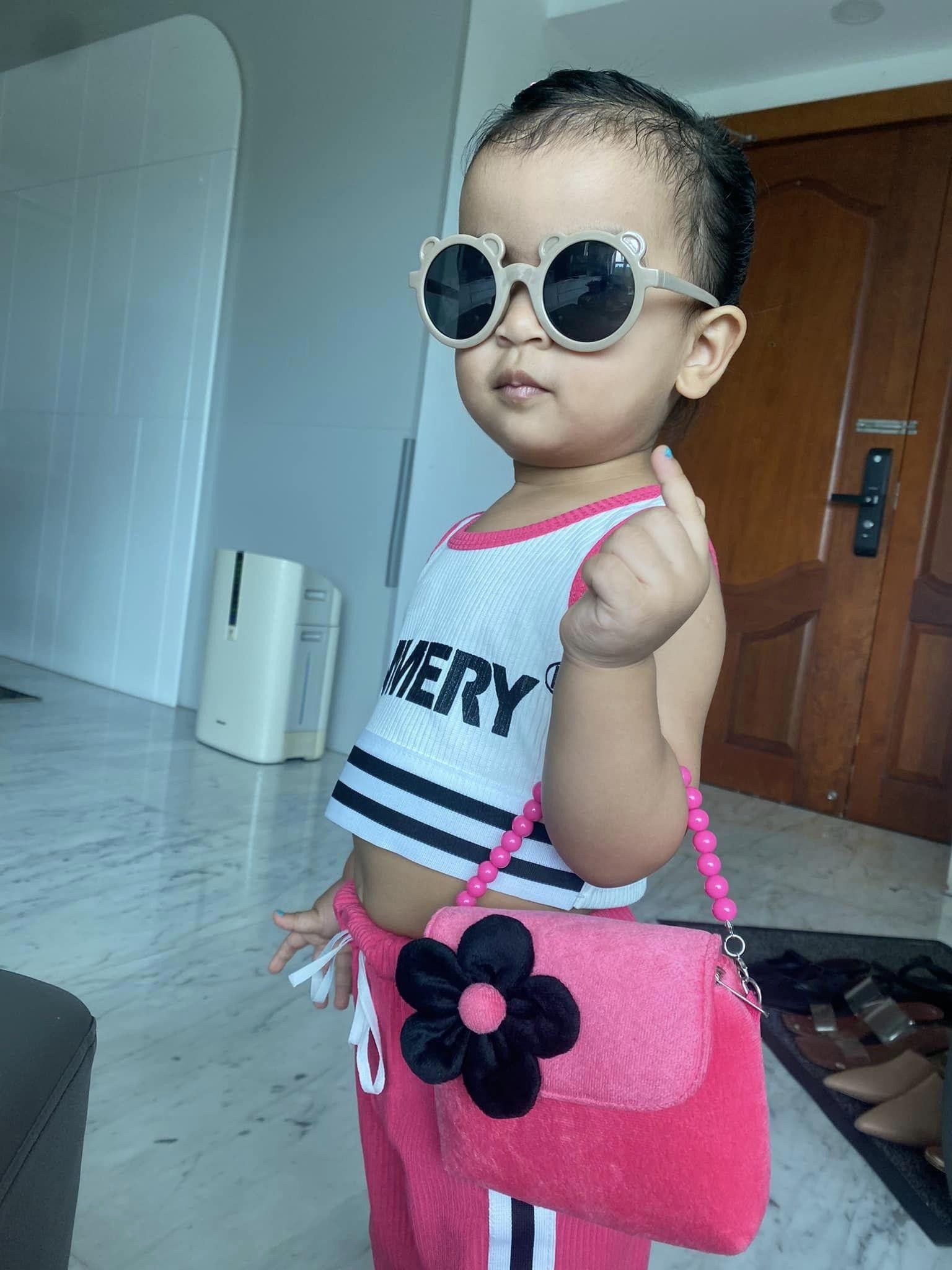 Em bé còn khẳng định được chất thời trang của mình với phụ kiện kính mắt đen, túi xách đồng điệu. Dường như được thừa hưởng nguồn gen nghệ sĩ từ mẹ mà Moon còn tạo dáng cực chất. Chiếc tay xách túi đưa lên cùng gương mặt sang như ngôi sao nổi tiếng tham dự tuần lễ thời trang quốc tế.