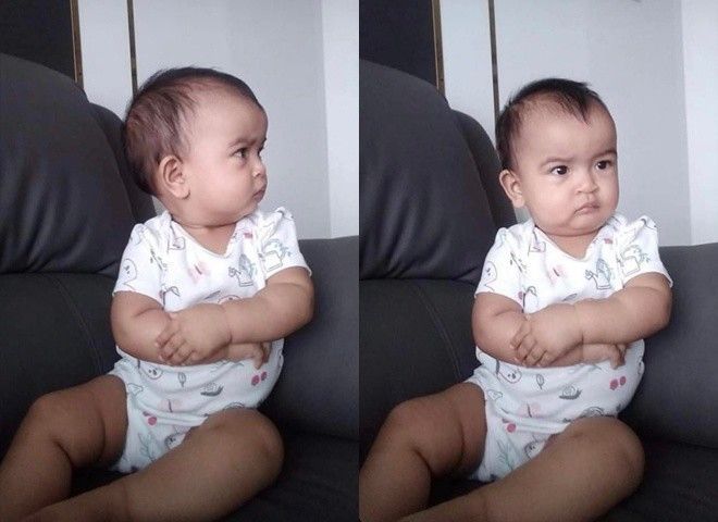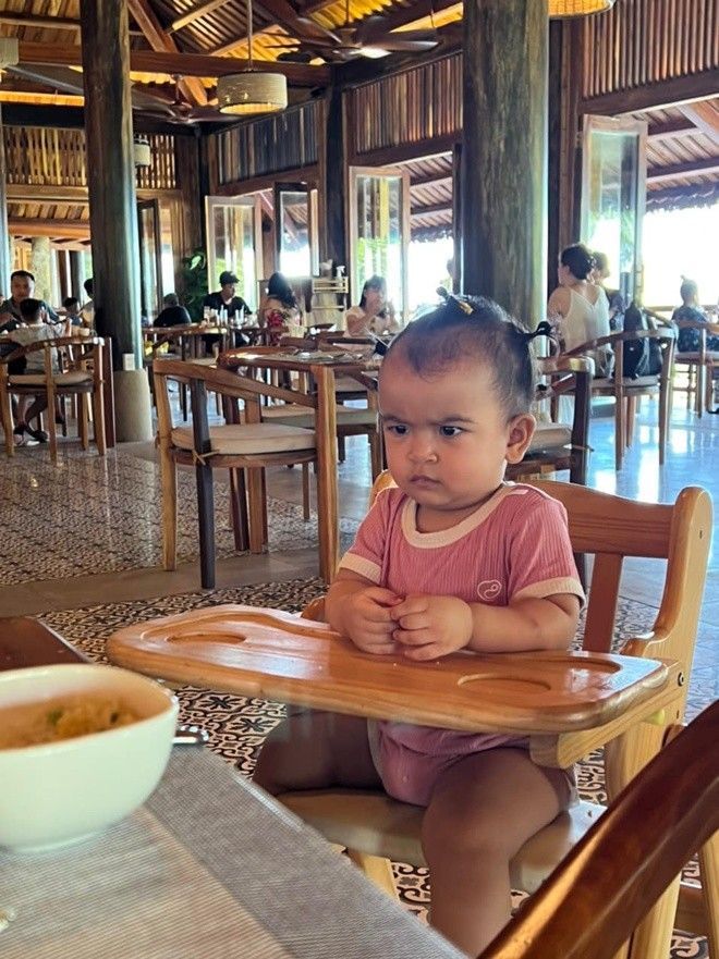 Ngoài mái tóc, gương mặt cau có của Moon cũng đã trở thành “thương hiệu của cô bé. Bởi nếu thường xuyên theo dõi trang cá nhân của Võ Hạ Trâm, khán giả sẽ thấy biểu cảm "mặt quạu" này khá quen thuộc. Trong nhiều hình ảnh và clip trước đó, bé Moon đã rất hay xuất hiện với gương mặt "khó đỡ" thế này.