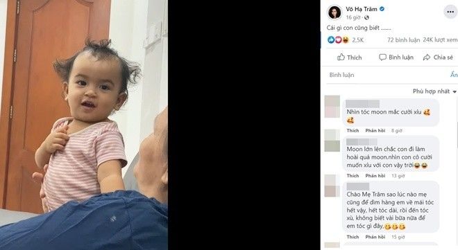 Lập tức, cư dân mạng để lại hàng loạt bình luận cảm thán: “Ối ai cột tóc Na Tra cho con mà lạ thế kia", "Sao vuốt cái tóc con nhỏ 3 chỏm vậy trời", "Ông bà bô để quả tóc em Moon chán thế chứ", "Chào mẹ Trâm. Sao lúc nào mẹ cũng dìm hàng em về mái tóc hết vậy. Hết tóc dài, rồi đến tóc xù, không biết vài bữa nữa để em tóc gì đây", "Moon thông minh quá, biết hết rồi. Sao hôm nay tóc uốn kiểu gì vậy? Không đẹp lắm nhé. Đội tóc giả đẹp hơn. Cưng lắm nhé Moon", "Nhìn tóc bé vui vui”…