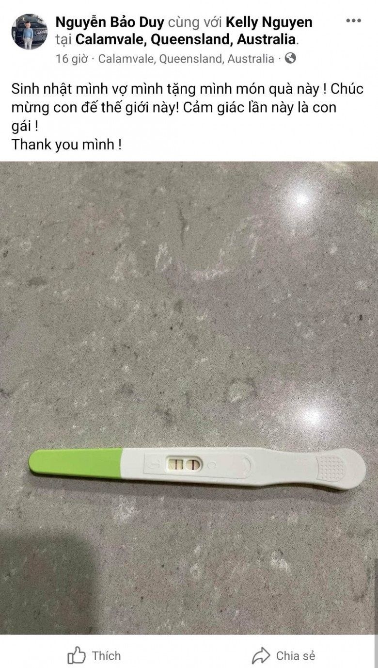 Cụ thể, ngày 5/1 vừa qua, Bảo Duy đăng tải bức ảnh que thử thai 2 vạch kèm thông báo chuẩn bị đón thêm thành viên mới. Theo đó, nhân dịp sinh nhật tuổi 39, anh được bà xã tặng món quà đặc biệt là tin báo đã mang thai. Trên trang cá nhân, chồng cũ Phi Thanh Vân viết: "Sinh nhật mình vợ mình tặng mình món quà này. Chúc mừng con đến thế giới này. Cảm giác lần này là con gái".