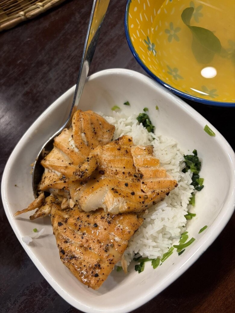 Bát cơm trắng dẻo ăn kèm với cá hồi áp chảo này là "cơm em Bão" - dành cho con trai út của nam nghệ sĩ, bên cạnh là bát nước luộc rau giúp bữa ăn thêm thanh đạm.