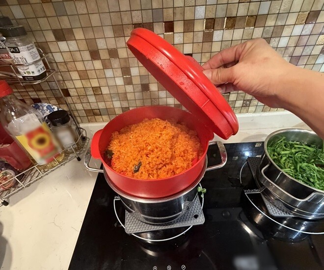Xôi gấc đỏ tươi được hấp nóng hổi trong nồi, đây là món ăn mà chị Hồng Nhung thường xuyên làm cho gia đình chứ không chỉ dịp đặc biệt.