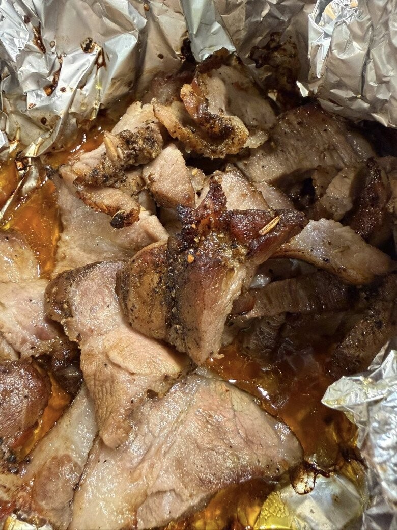 Những miếng thịt nướng thơm phức vừa ra lò vẫn còn giữ độ mọng nước, được bọc cẩn thận trong giấy bạc để giữ trọn vẹn mùi thơm của gia vị.
