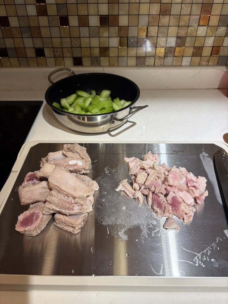 Từ công đoạn sơ chế, vợ nam NSND đã rất kỹ càng. Thịt lợn và sườn non được phân loại trên thớt, phần thịt nạc được thái nhỏ trong khi xương sườn được lọc bớt mỡ theo đúng khẩu vị người ăn. Chị cho biết: "Em có thói quen ăn sườn là phải sườn gầy có bao nhiêu thịt dày dày là thái hết".