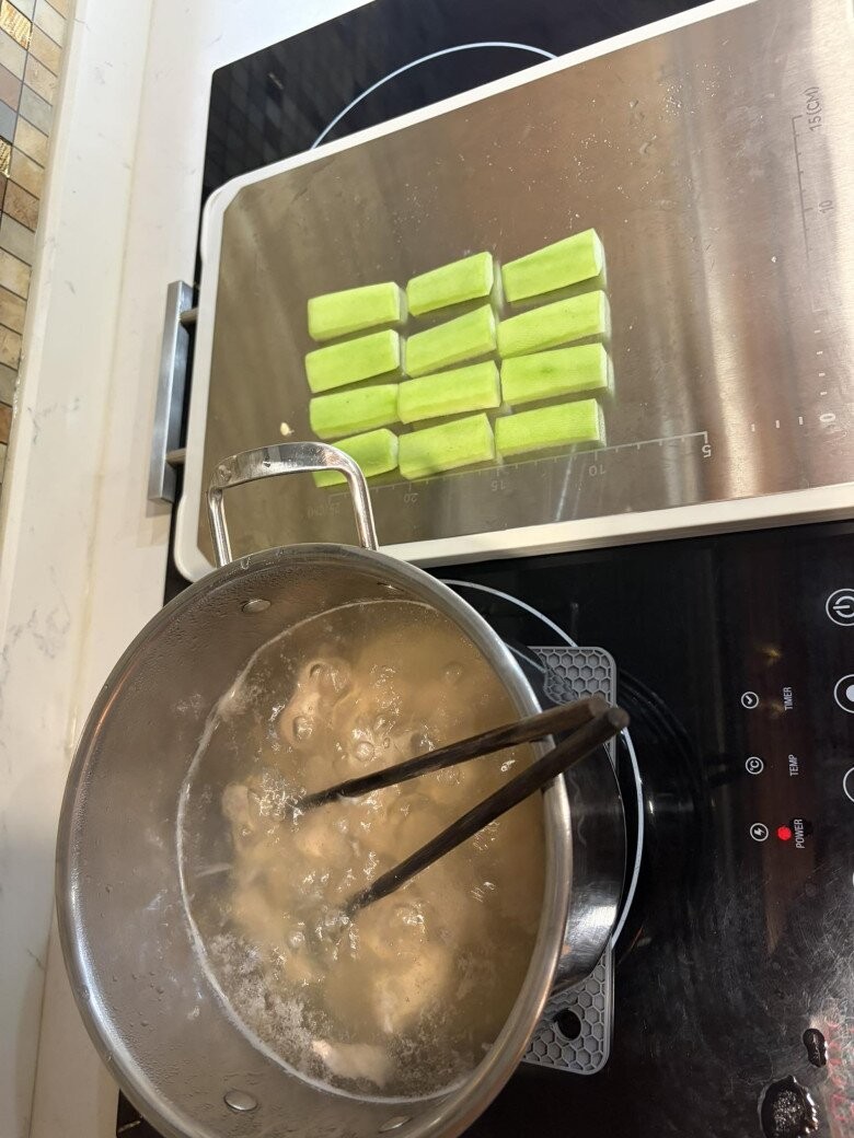 Sự kỹ tính của chị còn thể hiện qua cách sơ chế nguyên liệu. Chị có quy định riêng như bí xanh phải gọt đúng đoạn 5cm, hay khi mua sườn về thường lọc bớt phần thịt dày để riêng, chỉ để lại những dẻ sườn gầy đúng sở thích của gia đình.