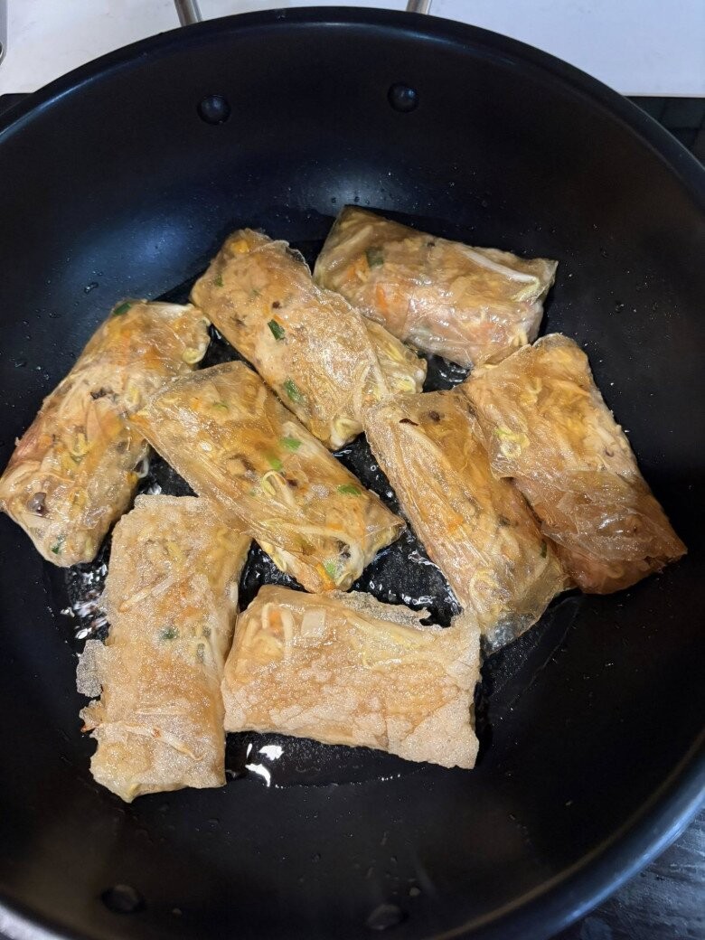 Những chiếc nem nhân thịt và rau củ được rán trong chảo dầu bắt đầu chuyển sang màu vàng giòn hấp dẫn. Chị Hồng Nhung thi thoảng bày tỏ thèm nem rán do chính mình làm.
