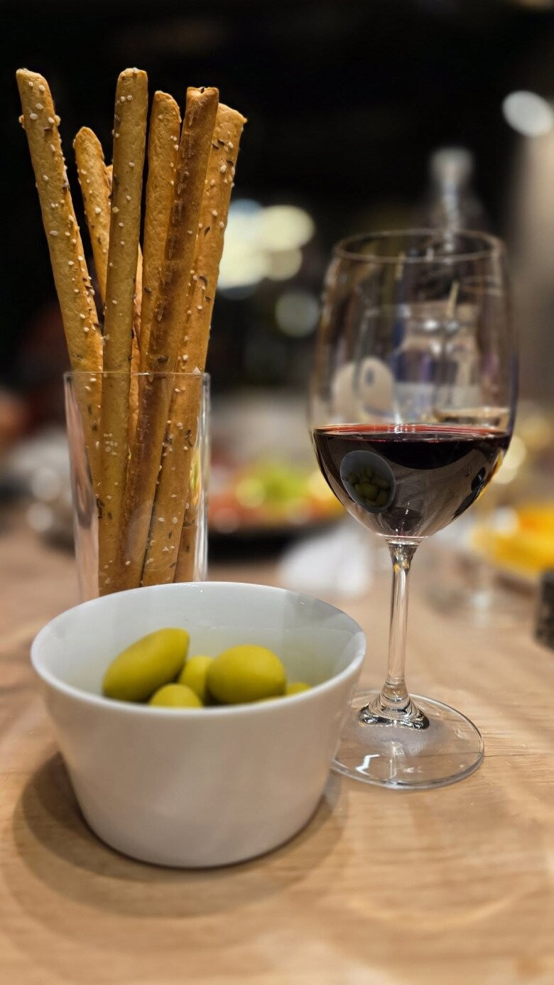 Ngoài những bữa ăn mặn, nam nghệ sĩ còn chia sẻ phút thư giãn nhẹ nhàng với ly rượu vang đỏ cùng chút đồ nhắm đơn giản gồm quả ô liu xanh và bánh que giòn cho buổi tối cuối tuần.
