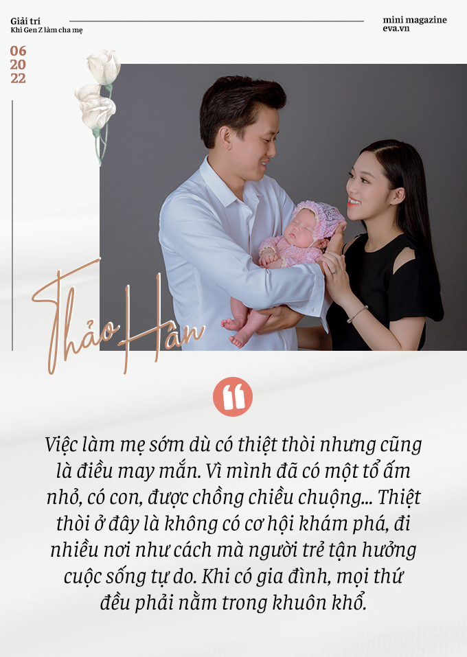 Có lẽ là sự trải nghiệm. Dù hiện tại cuộc sống làm mẹ ở tuổi 22 với Hân rất thú vị, nhưng mình thiếu trải nghiệm so với bạn bè đồng trang lứa. Có thể họ bây giờ đang vui chơi, khám phá cuộc sống mới, tích lũy kinh nghiệm… Nhưng Hân lại có những cảm xúc riêng khi được chăm sóc gia đình. Chồng sẵn sàng cho Hân đi chơi, nhưng trách nhiệm làm mẹ, làm vợ của mình không cho phép điều đó.
