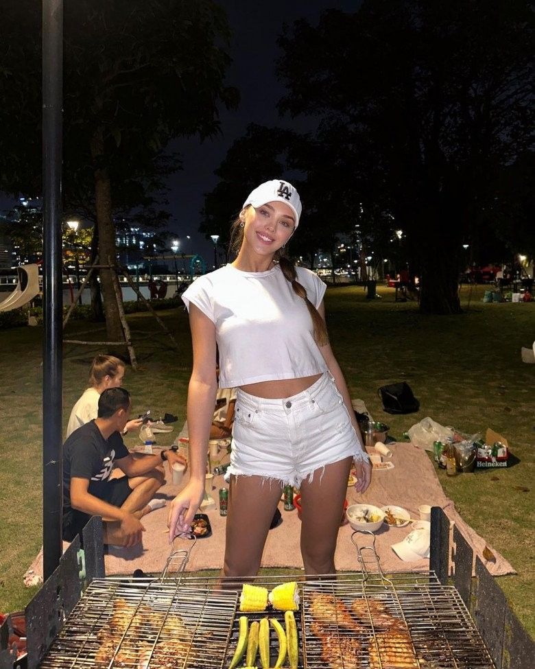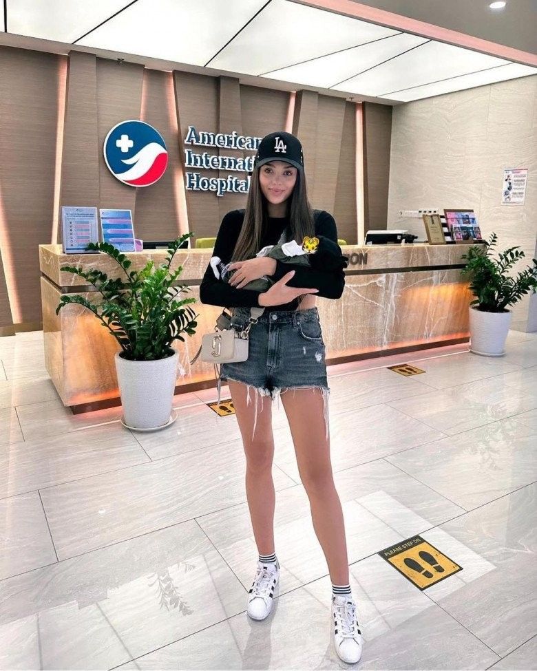 Người đẹp Ukraine dù mới "vượt cạn" nhưng đã tự tin diện những trang phục khoe vai và đôi chân dài miên man.