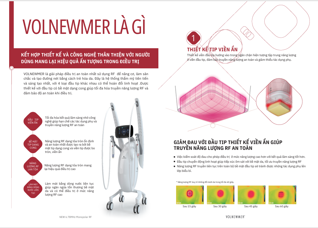 Khác với các công nghệ giảm mỡ truyền thống, Volnewmer sử dụng sóng RF đơn cực tần số cao 6,78 MHz, truyền năng lượng nhiệt sâu vào các mô mỡ dưới da. Quá trình này làm phân hủy mỡ thừa một cách an toàn, đồng thời kích thích mạnh mẽ sản sinh collagen và elastin để cải thiện độ đàn hồi, hạn chế tối đa tình trạng chảy xệ sau giảm mỡ.