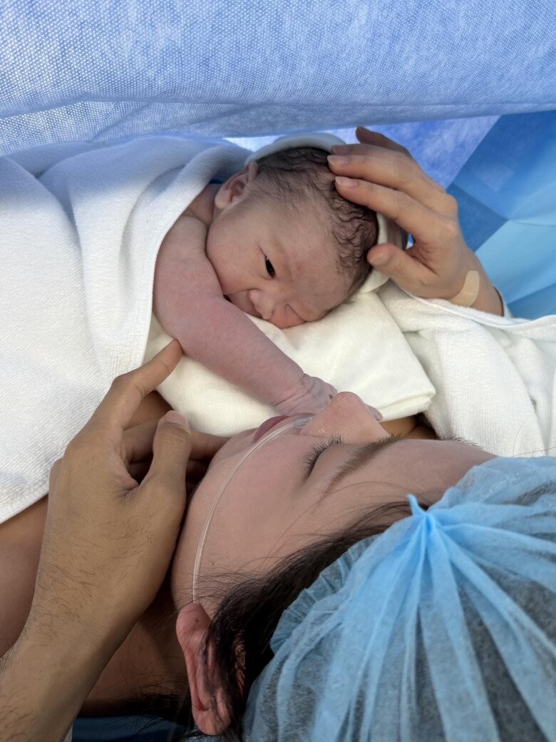 Khoảnh khắc Vũ Ngọc Anh "da kề da" với bé Mario.