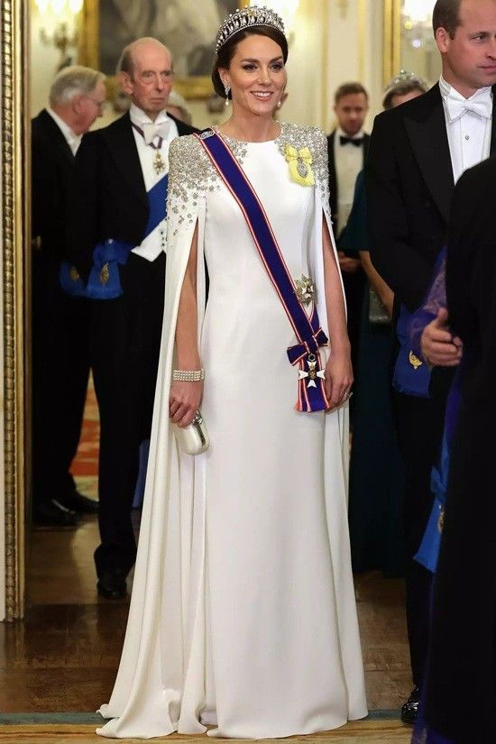 Có thể thấy, thiết kế lần này có kiểu dáng tương tự chiếc váy được Kate Middleton trưng dụng trong tiệc chiêu đãi cấp nhà nước năm ngoái. Khi đó, Vương phi xứ Wales cũng đội vương miện cao quý.