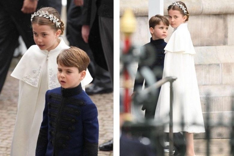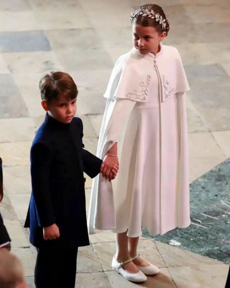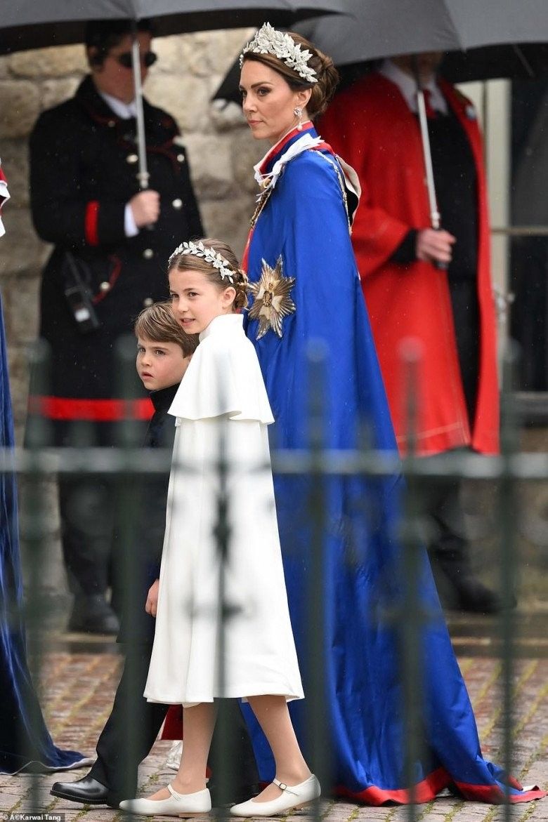 Dù thể hiện trọn vẹn sự tinh tế, trang trọng của bản thân thế nhưng trong buổi lễ đăng quang lần này, Công nương Kate dường như vẫn bị chiếm sóng bởi một nhân vật "quyền lực". Đó chính là con gái cô - Công chúa Charlotte. Nàng công chúa đi giày búp bê mũi nhọn xinh xắn, diện bộ váy trắng ngà có thiết kế tương tự mẹ cùng đeo vòng hoa 3D từ bạc sang trọng.