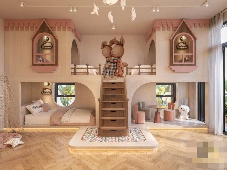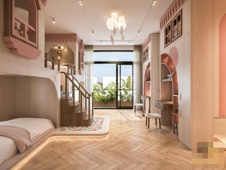 Phòng ngủ dành riêng cho 3 ái nữ nhà Vân Trang mang đậm chất công chúa với tông màu hồng ngọt ngào. Các bé có khu vực giường ngủ, học tập, vui chơi riêng biệt.