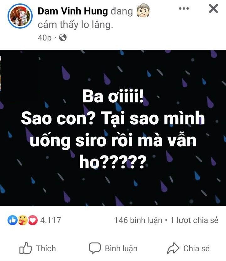 Mới đây khi nửa đêm, Đàm Vĩnh Hưng đăng đàn chia sẻ, than thở về chuyện bé Polo Huỳnh bị ho mãi không khỏi mặc dù đã uống nhiều loại siro được nhiều người quan tâm. Cụ thể, ban đầu ông bố đơn thân lo lắng kể về cuộc hội thoại của hai bố con: "Ba ơi! Sao con? Tại sao mình uống siro rồi mà vẫn ho?". Câu hỏi của con trai khiến người làm bố như Đàm Vĩnh Hưng cảm thấy đau đớn vô cùng vì không biết giúp con được gì bây giờ.