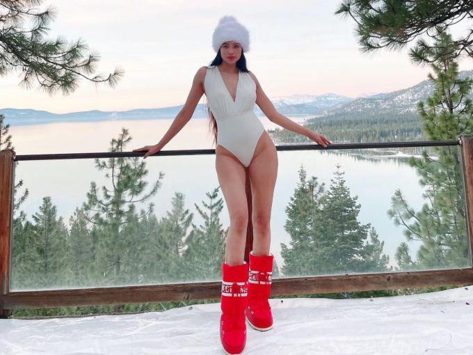Mới đây, "MC 3000 chữ" vừa có dịp khiến fans "mắt tròn mắt dẹt" với màn trưng diện không thể trội hơn giữa trời tuyết. Chân dài hé lộ, cô mang theo vali với 10 bộ bikini để chụp hình nhưng không ngờ nước Mỹ đón chào cô với trận bão tuyết siêu lớn. Dẫu vậy, cô vẫn "cắn răng chịu lạnh" mặc và chụp hình hết mới thỏa mãn.