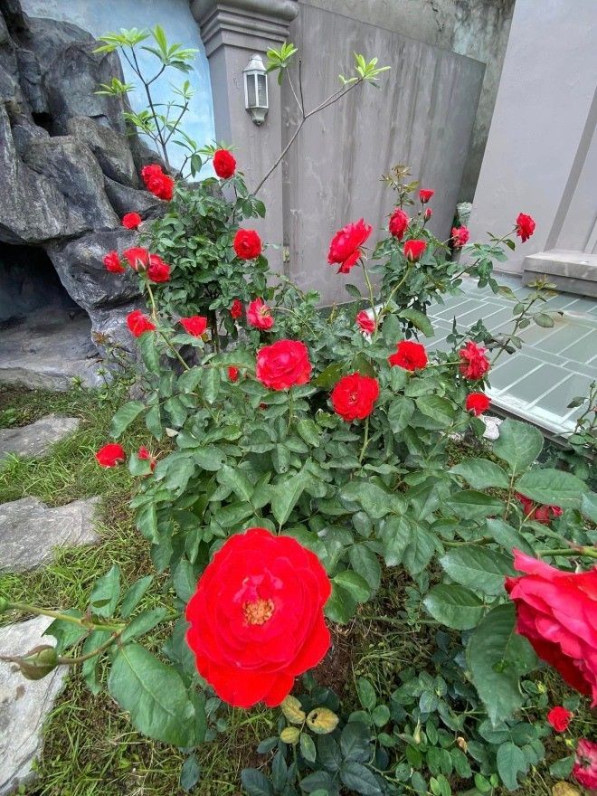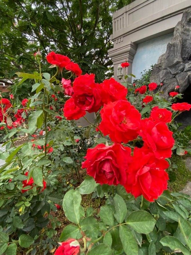 Vườn hồng trong biệt thự tại Hải Phòng của Vy Oanh màu đỏ rực.