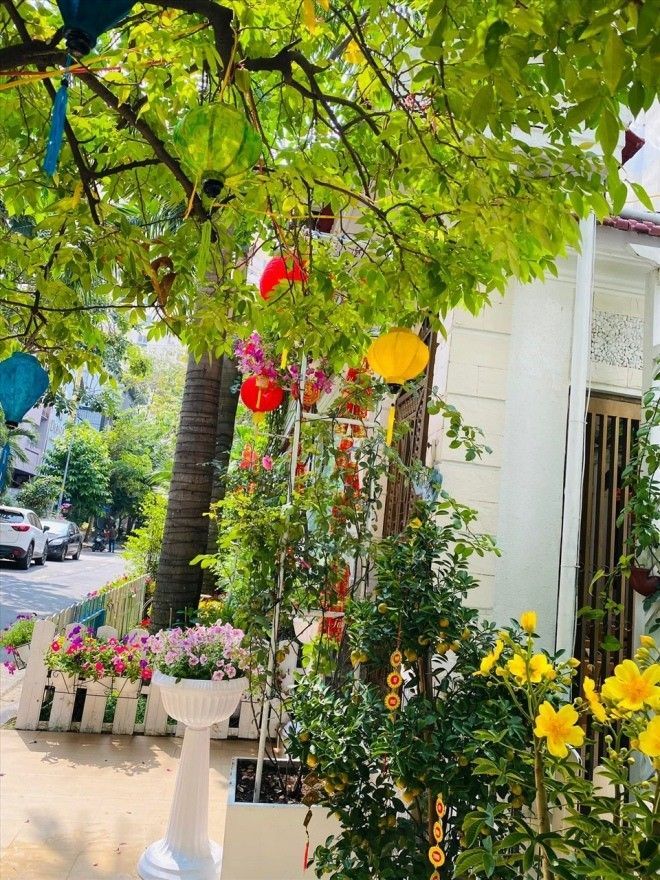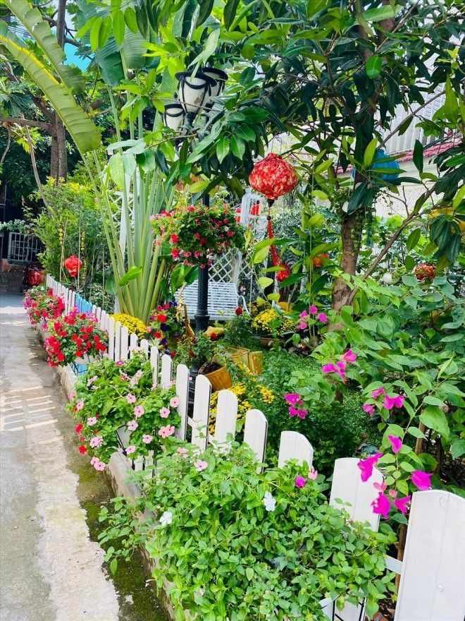 Bên ngoài nhà là những khóm hoa rực rỡ như dạ yến thảo, hoa mười giờ...