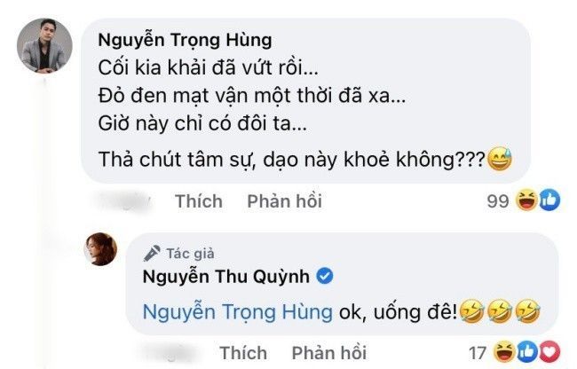 Trọng Hùng liền dùng thơ đáp lại: "Cối kia Khải đã vứt rồi… - Đỏ đen mạt vận một thời đã xa… - Giờ này chỉ có đôi ta… - Thả chút tâm sự, dạo này khoẻ không???". Thu Quỳnh tiếp tục hài hước trả lời "Khải mũ cối": "Ok, uống đê" khiến cư dân mạng không khỏi bật cười.