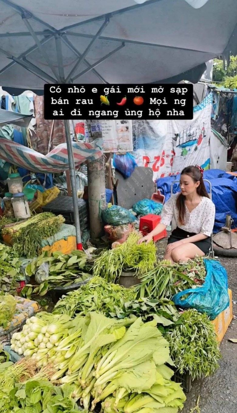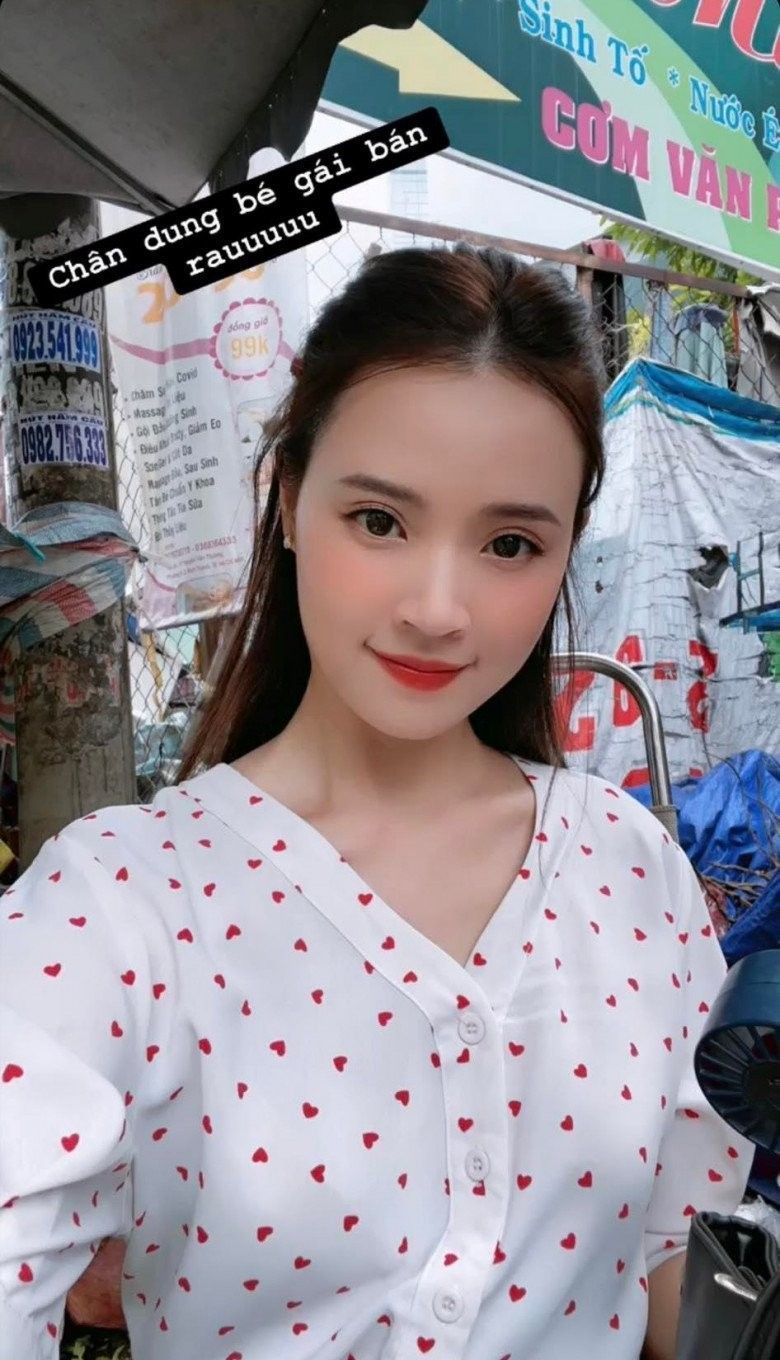 Cô nàng đăng tải mạng xã hội với dòng chú thích: "Có nhỏ em gái mới mở sạp bán rau. Mọi người ai đi ngang ủng hộ nha". Nhìn ở góc nhìn xa, cô nàng tinh khôi với bộ cánh mang màu sắc đơn giản là trắng đen nhưng góc nghiêng lại rất thuyết phục.