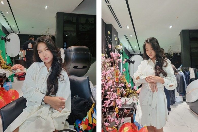 Ngay cả trong những shoot ảnh quảng cáo chụp cùng bố, được tạo kiểu tóc cầu kỳ, trang phục chỉn chu nhưng Chíp vẫn để mặt mộc mạc, chỉ tô điểm với màu son tự nhiên.