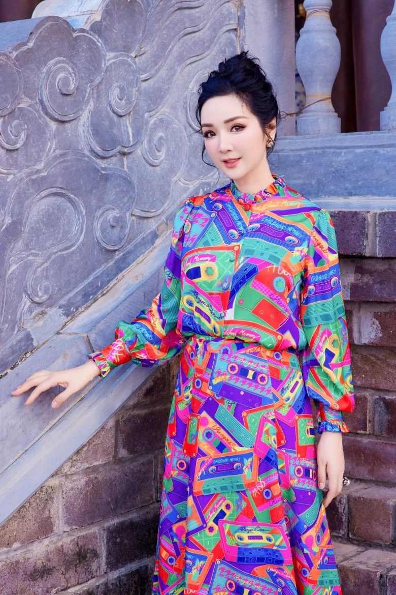 Hoa hậu Đền Hùng 1992 luôn yêu thích những chiếc váy nổi bật với hoa văn nhiều màu sắc.