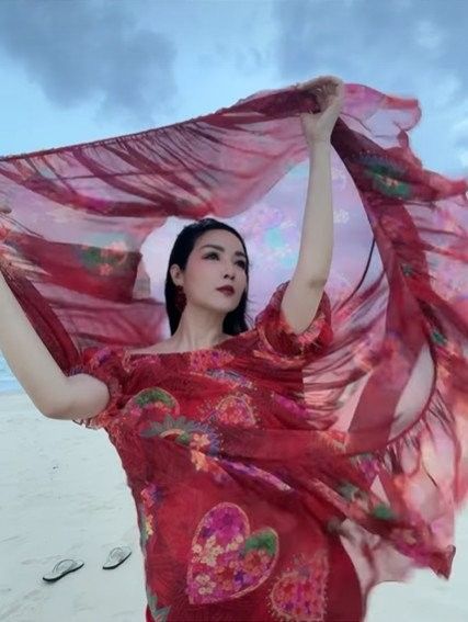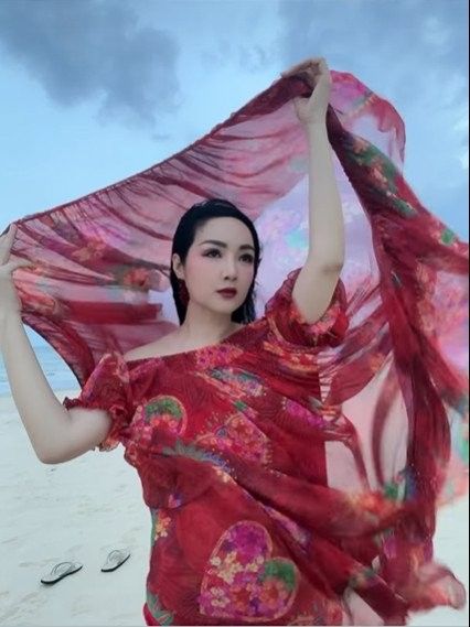 Mới đây, nàng Hậu có 1-0-2 của Việt Nam tiếp tục gây chú ý khi diện chiếc váy hoa màu đỏ nổi bật khoe dáng trên biển. Trong bộ áo đỏ, cô khoe làn da trắng mịn không tì vết dù đã bước sang tuổi 52. Đặc biệt, cách tạo dáng độc đáo của cô trước làn gió biển thu hút sự quan tâm từ cư dân mạng.