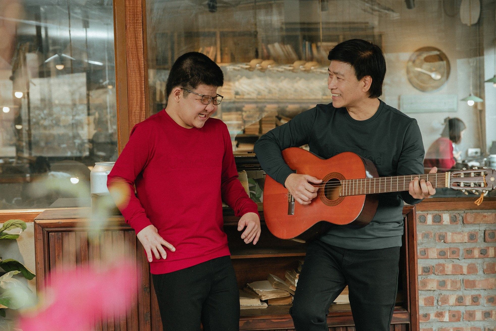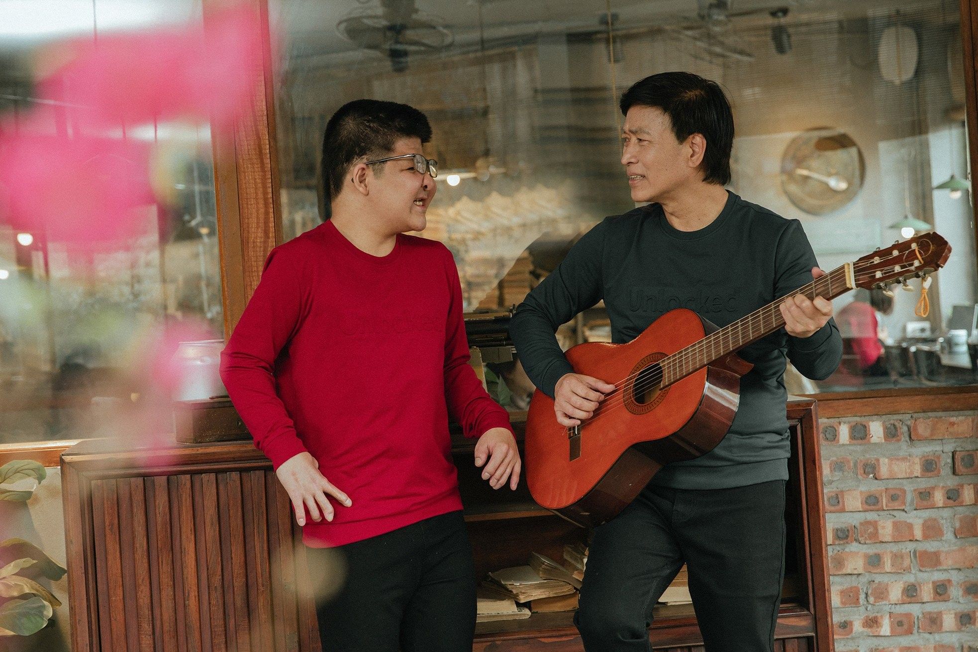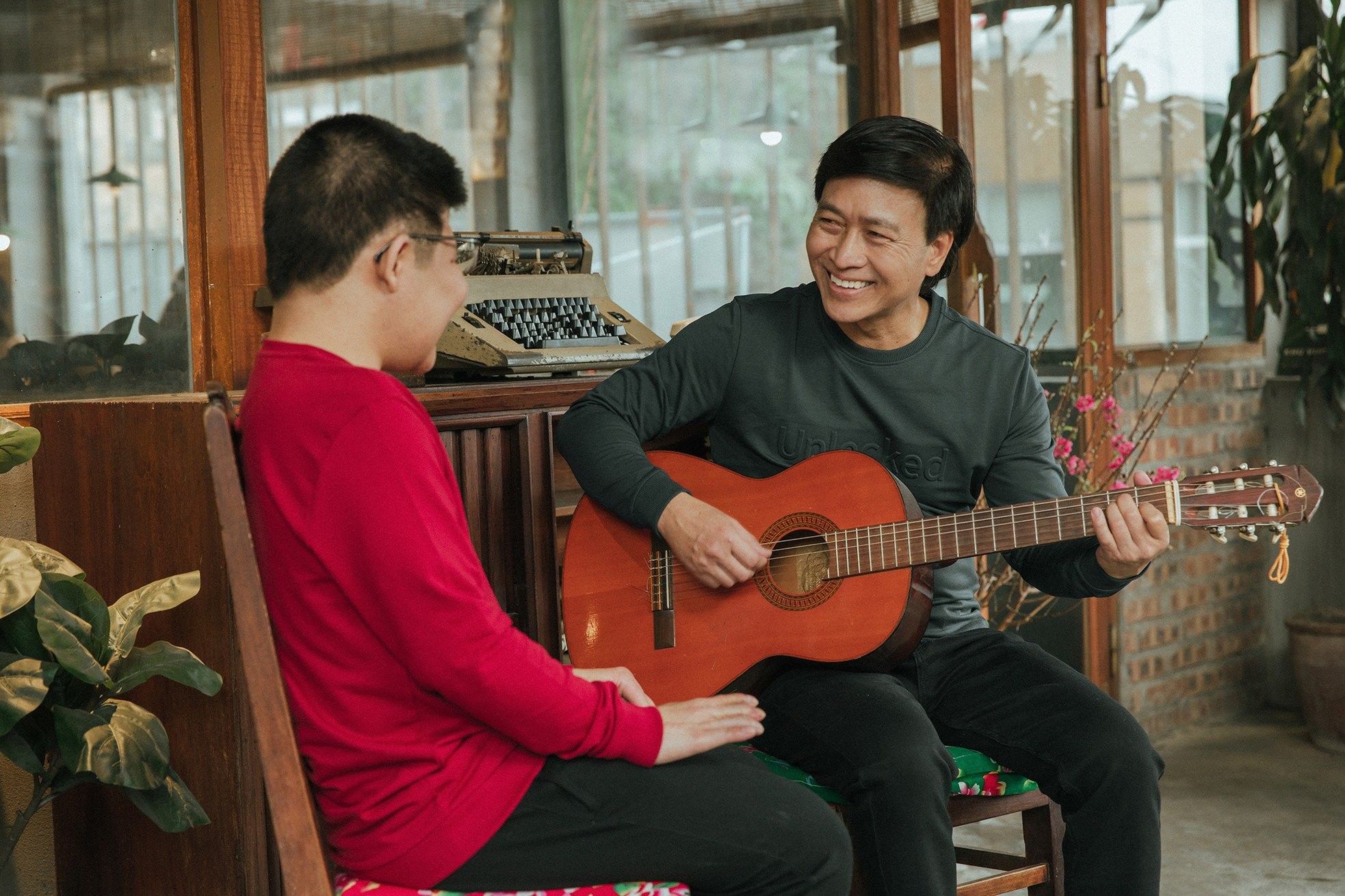 Quốc Tuấn và con trai có những giây phút thảnh thơi khi cùng nhau uống trà, đọc sách, đàn hát cho nhau nghe. Cả hai bố con đều có chung nhiều sở thích.