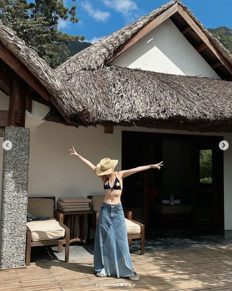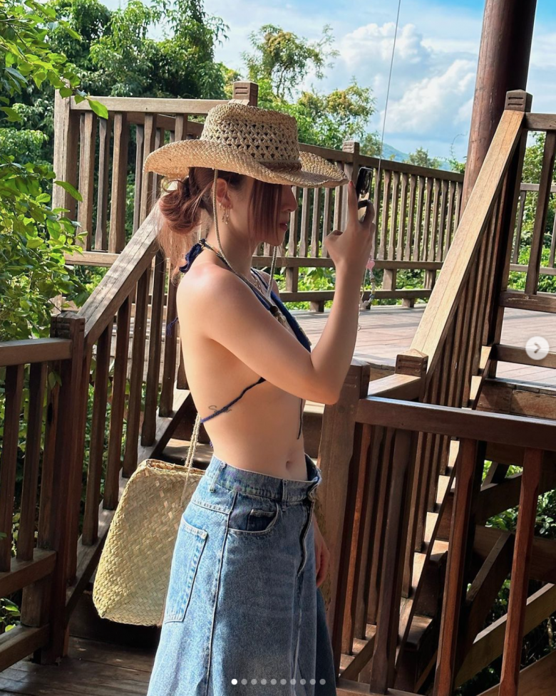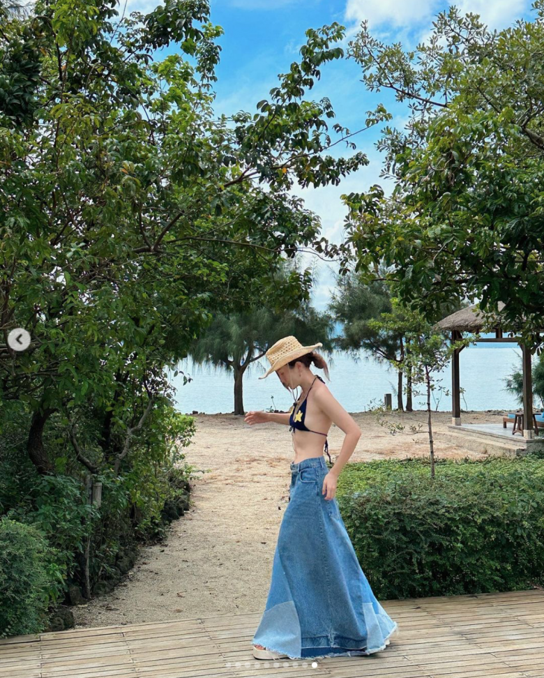 Chẳng cần mặc cả set bikini, Yến Nhi tự do phối áo bratop tí hon cùng chân váy jeans dài. Tuy nhiên, outfit này vẫn đủ giúp cô làm bật hình thể chuẩn mực.
